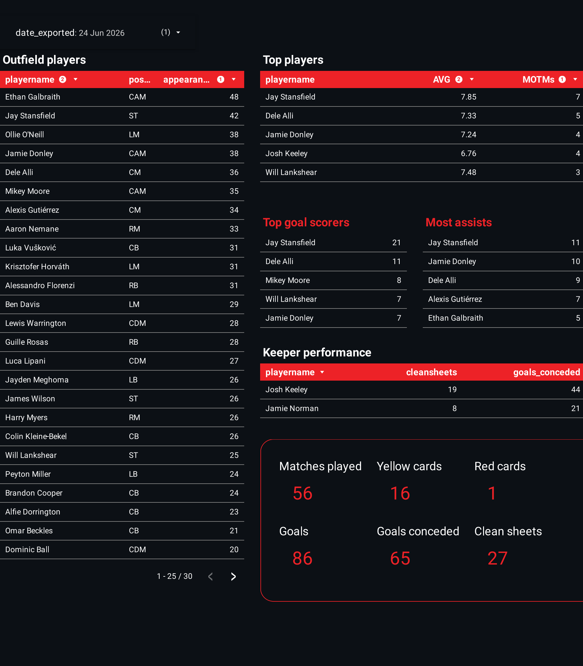 Josh Keeley maintained 19 clean sheets while conceding 44 goals, while Jamie Norman kept 8 clean sheets and conceded 21 goals.