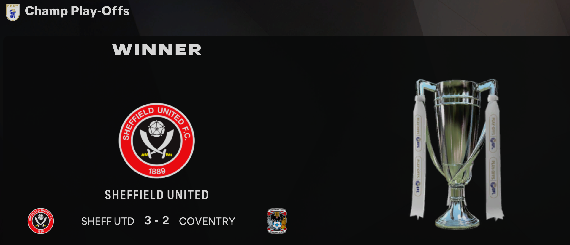 Sheffield United went on to win the playoffs and secure promotion to the Premier League. The playoff matches exposed some tactical vulnerabilities in our system, particularly in dealing with their high-pressing game and quick transitions.